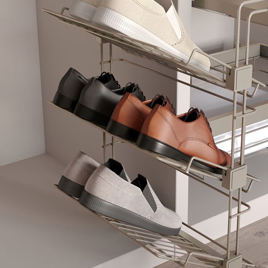 Bočný výsuvný stojan na topánky je navrhnutý na efektívne usporiadanie obuvi v Hack šatníkoch a šatníkových miestnostiach. Dostupný v ľavej alebo pravej variante, stojan umožňuje maximálne využitie priestoru vo vnútri skrine a zároveň uľahčuje prístup k obuvi vďaka skrytým vodiacom lištám s čiastočným výsuvom a mäkkým zatváraním.