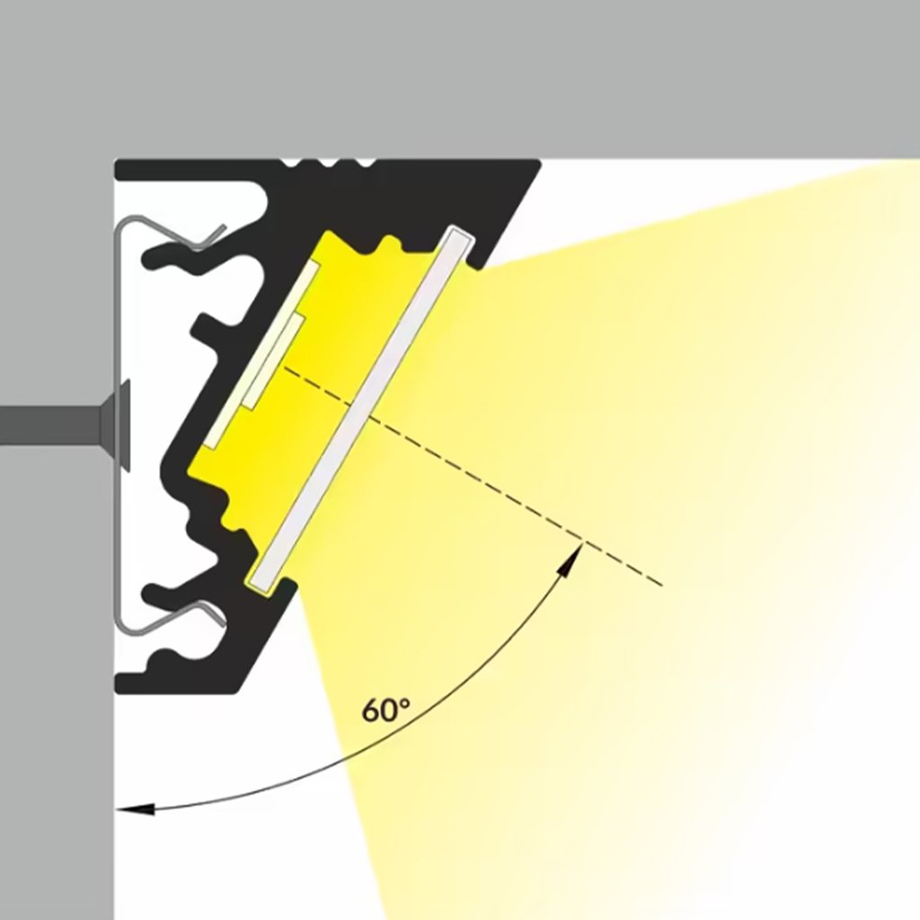 Univerzálny uhlový profil so svitom v uhle 60° alebo 30°, s bohatou výbavou doplnkov pre montáž a rôznymi druhmi difúzorov. Jednoduchá práca a profesionálny vzhľad.