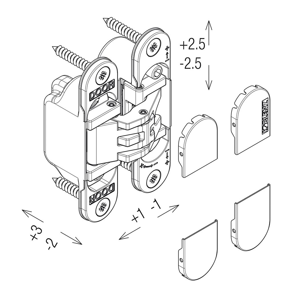 - Rozmery: Hrúbka dverí min. 32 mm, šírka krídla závesu 23,5 mm, dĺžka krídla závesu 95 mm, hrúbka protiplechu 4,5 mm