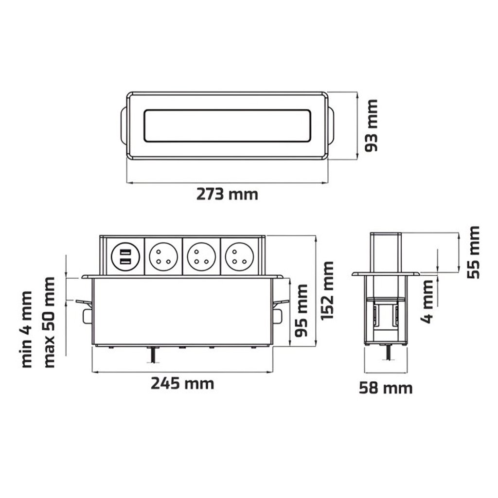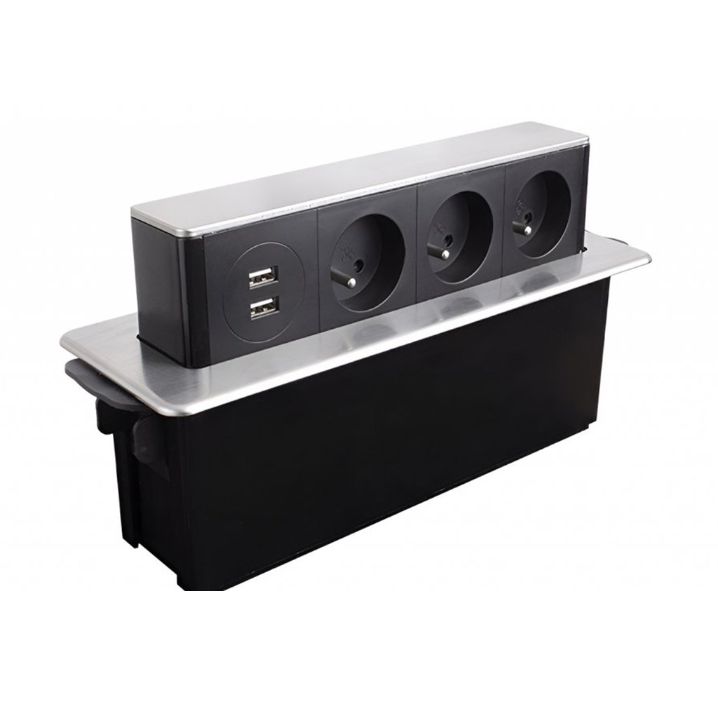 Elektrická zásuvka - HOP BOX, povrchová úprava z brúsenej ocele, 3x franc.zásuvky, 2x USB TYP A, 2m