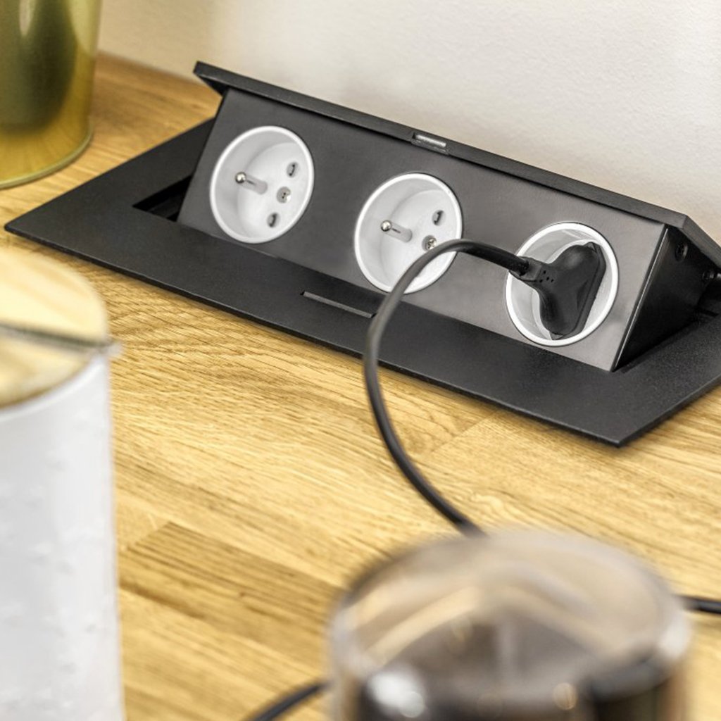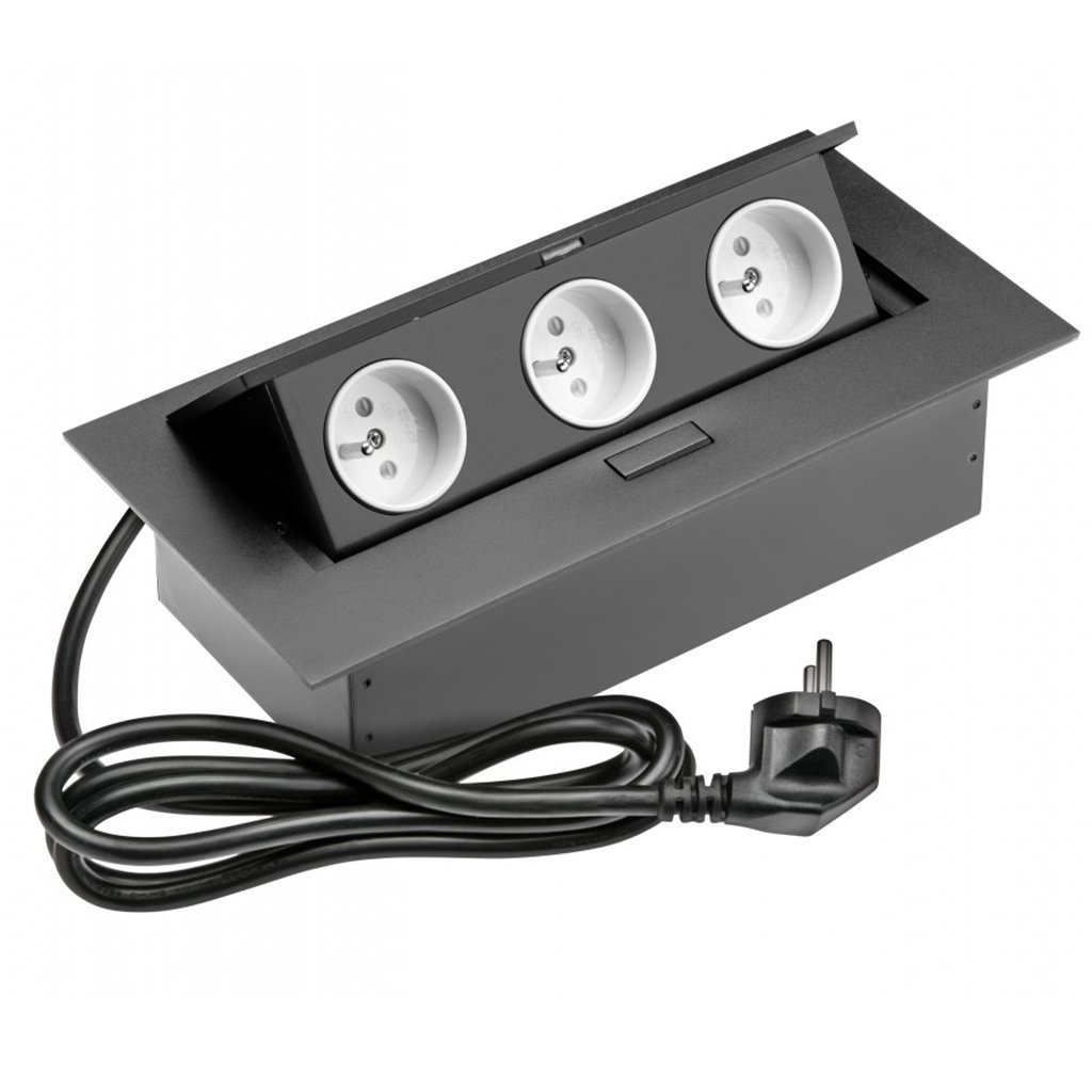Klasická obdĺžniková zapustená zásuvka bude skvelým riešením pre minimalistov a všetkých ľudí, ktorí si cenia jednoduchosť. Neviditeľne splynie s povrchom akéhokoľvek pracovného stola. Je k dispozícii v štandardných farbách, ktoré sa hodia k väčšine pracovných dosiek: biela, čierna a hliníková. Produkt sa dodáva s 3 napájacími zásuvkami alebo 2 napájacími zásuvkami a 2 portami USB-A.