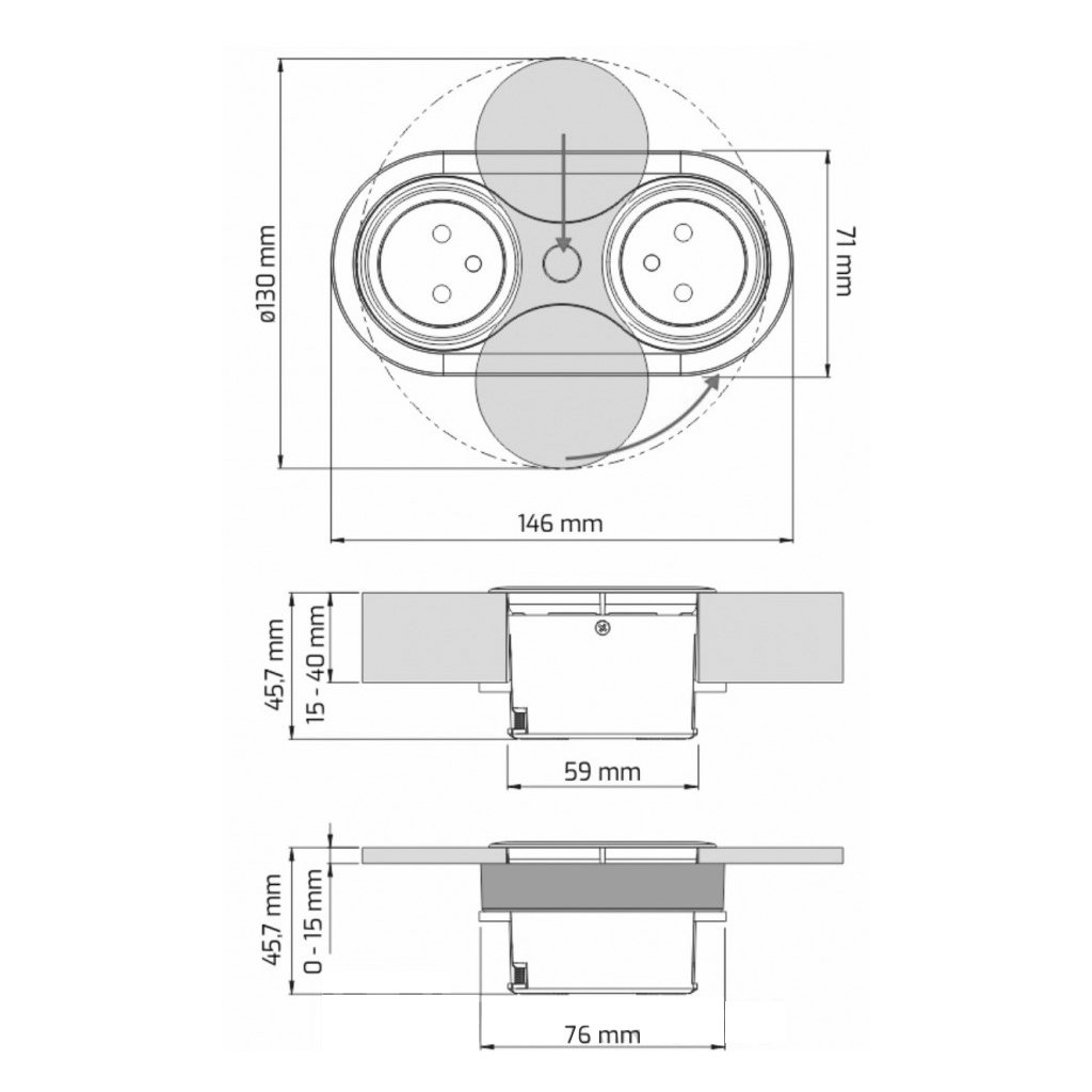 Vlastnosti: 2 x 230V; Farba: čierna; Kábel: 2 m; Materiál: nehrdzavejúca oceľ; Napájací kábel: 1m; Otvor: otočenie krytu; Púzdro: Dĺžka: 146 mm; Šírka: 71 mm; Otvor zásuvky: Dĺžka: 135 mm; Šírka: 60 mm; Hĺbka: 47 ,5 mm.