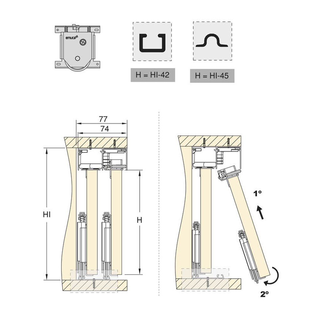 Súprava montážnych dielov Emuca Placard Kit 74 je ideálnym riešením pre spoľahlivú a tichú inštaláciu posuvných dverí v rôznych interiérových a komerčných aplikáciách.