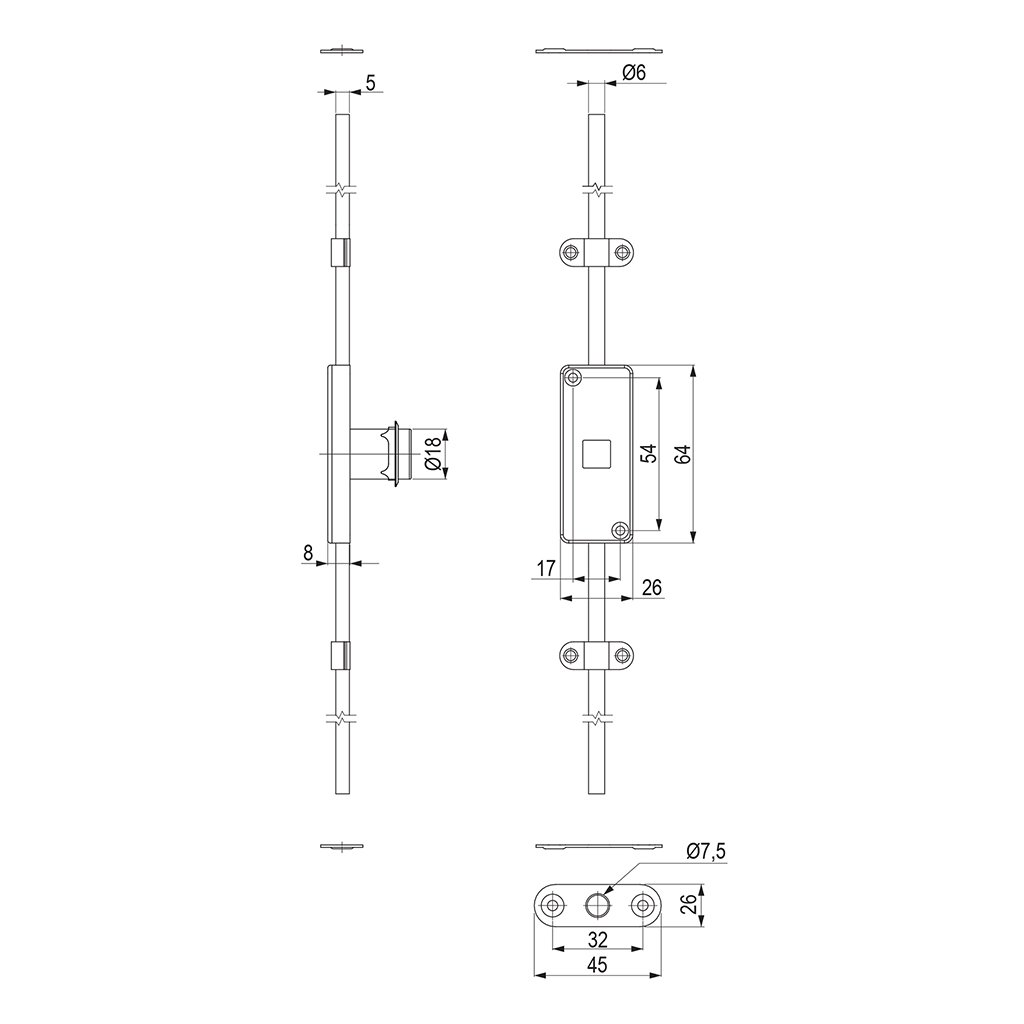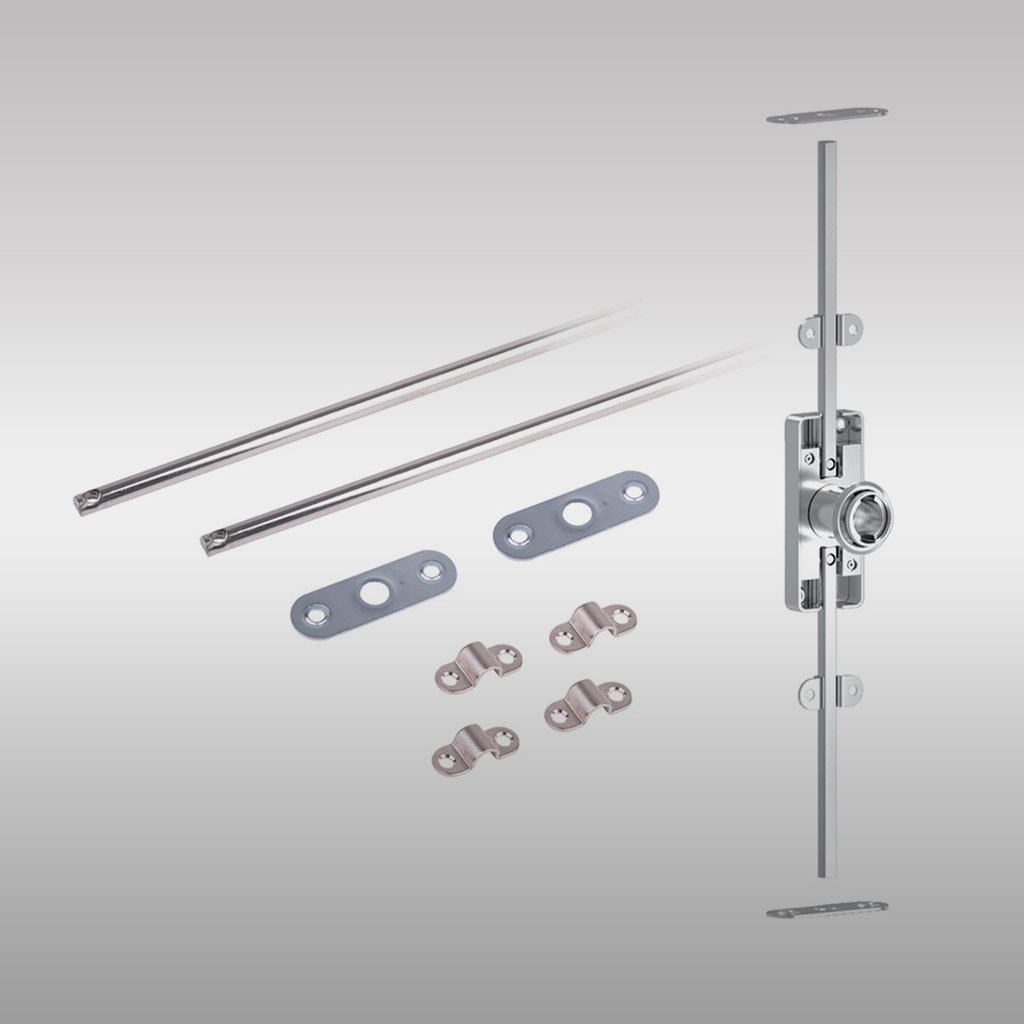 Kompletná sada – zámok, rozeta, 4× držiak tyče, 2× protikus a 2× tyč 1000 mm.