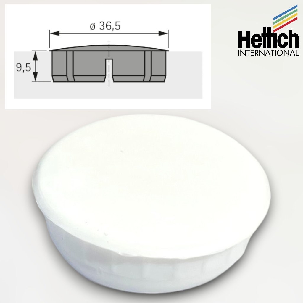 Biela plastová krytka pre otvor s priemerom ø 35 mm a hĺbkou 9,5 mm. Ideálna pre zakrytie montážnych otvorov, aby sa zabezpečil čistý a estetický vzhľad nábytku.