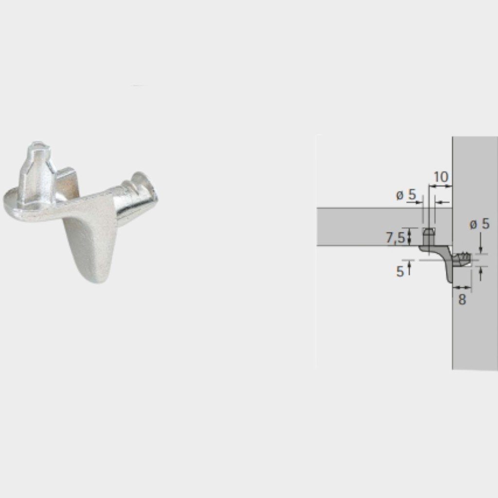 Hettich - Policová podperka - Sekura 1.1 - s nosom je praktickým doplnkom na nábytok, ktorý zabezpečuje stabilitu políc. S priemerom čapu 5 mm a jedným poistným čapom ponúka spoľahlivú podporu pre nábytkové systémy. Je vyrobená z poniklovaného zinkového odliatku, čo zaručuje jej dlhodobú odolnosť a ochranu proti korózii. Ideálna na pripevnenie políc, pričom poskytuje pevnú a bezpečnú inštaláciu pre rôzne typy nábytku.