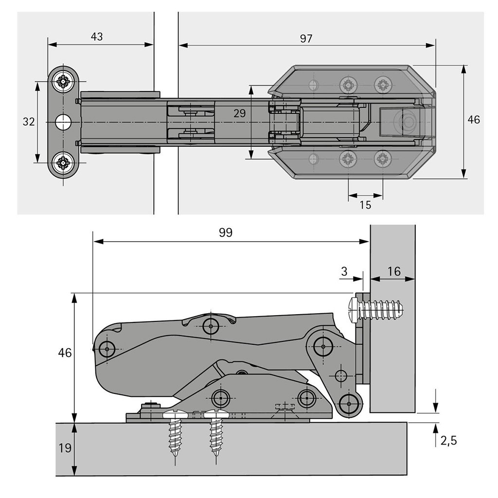 Záves je vhodný pre korpusy s hrúbkou bočnice 16 mm alebo 19 mm, pričom jeho kovová, pozinkovaná konštrukcia zabezpečuje dlhú životnosť a stabilitu. Vďaka uhlu otvorenia 115° poskytuje dostatočný priestor na pohodlné používanie dvierok chladničky.