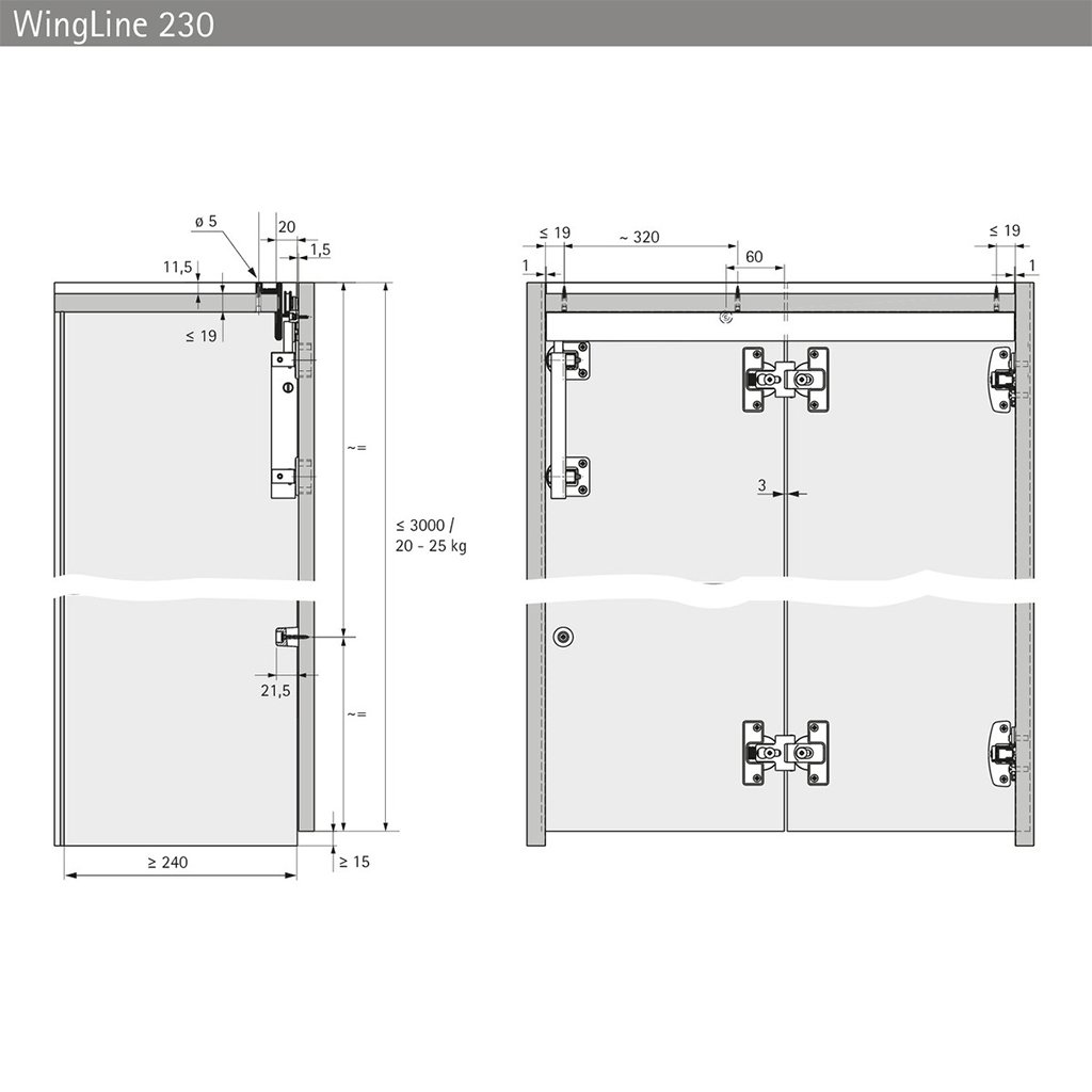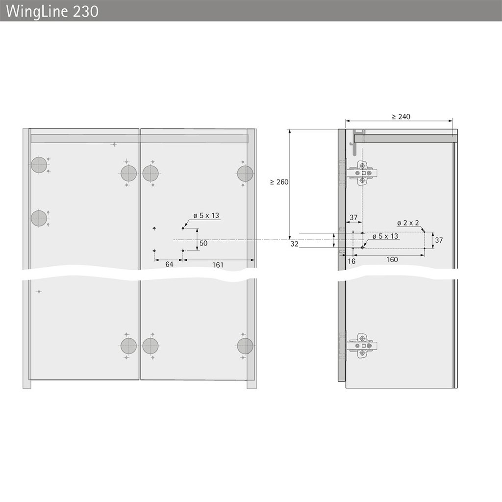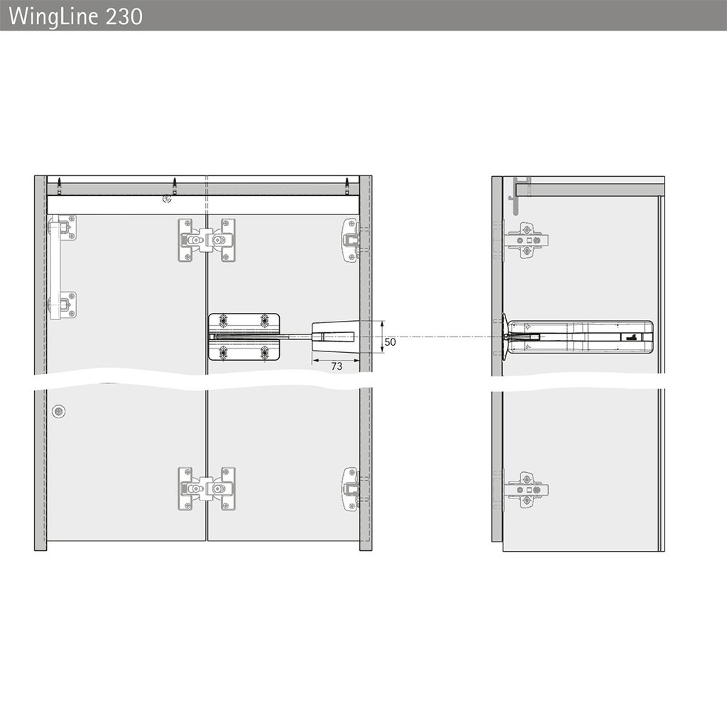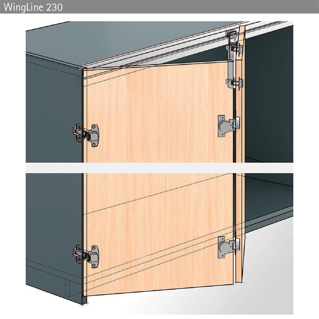 Komponent je vybavený dvoma skrytými pántmi a je určený pre systémy skladacích dverí spojených s bokom korpusu s horným nosným profilom. Ideálne riešenie pre široké a vysoké dverné krídla, kde je požadovaná spoľahlivosť, stabilita a komfort používania. Pojazdová jednotka je súčasťou horného vozíkového systému WingLine 230.