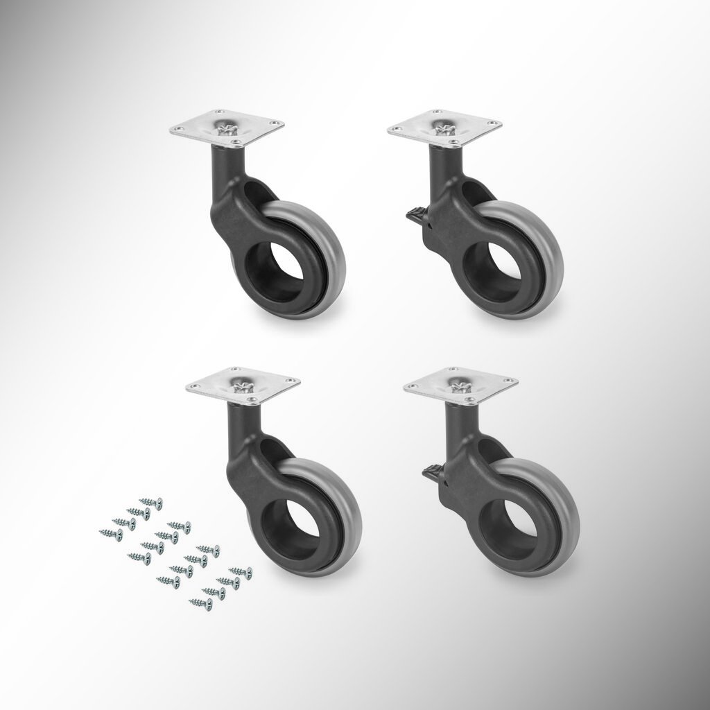 - Súprava: Obsahuje 4 kolieska (2 s brzdou, 2 bez brzdy) a montážne skrutky.