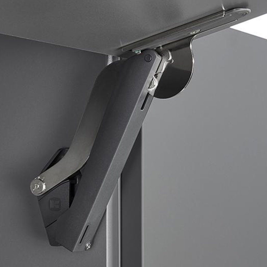FREEspace Typ F je robustný zdvihák pre nábytkové čelá, ideálny pre skrinky s výškou 225 – 650 mm a hmotnosťou čela 4,6 – 19,1 kg. Tento systém umožňuje zdvíhanie veľkých čiel nahor, poskytujúc ľahký prístup do skrinky a maximálnu voľnosť pohybu nad skrinkou.