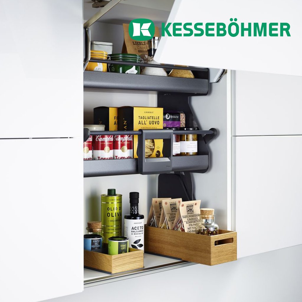 Inovatívny výsuvný systém Kesseböhmer iMove pre horné kuchynské skrinky s korpusom šírky 600 mm ponúka ergonomické a pohodlné riešenie pre prístup k ťažko dostupným horným policám. Systém umožňuje jednoduché stiahnutie obsahu skrinky smerom nadol a dopredu pomocou jednej ruky, čím zabezpečuje pohodlný prístup k uloženým predmetom bez potreby stoličky alebo rebríka.