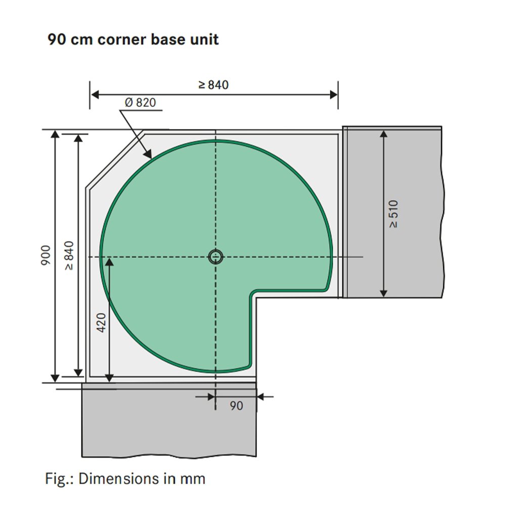 Určené pre spodný rohový korpus o šírke 900 mm (3/4). Sada dvoch kusov políc Arena Classic, dno s Anti-slip, protišmykovou povrchovou úpravou. Určené pre korpusy s klasicky otváranými dvierkami na závesoch. Vnútorný rozmer korpusu: šírka - väčšia, aelbo rovná 840mm, hĺbka - väčšia alebo rovná 840mm, výška 655-745mm. Priemer police: 820mm. Pre montovanie treba doobjednať tyč (PLU K00968).