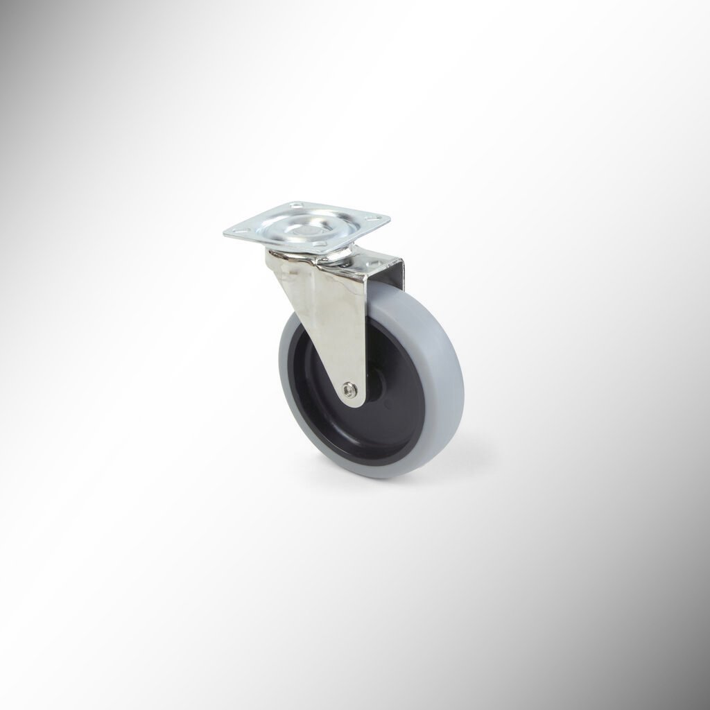 - Kvalitné materiály: Oceľová konštrukcia a plastové kolieska s gumovým behúňom v sivej farbe.