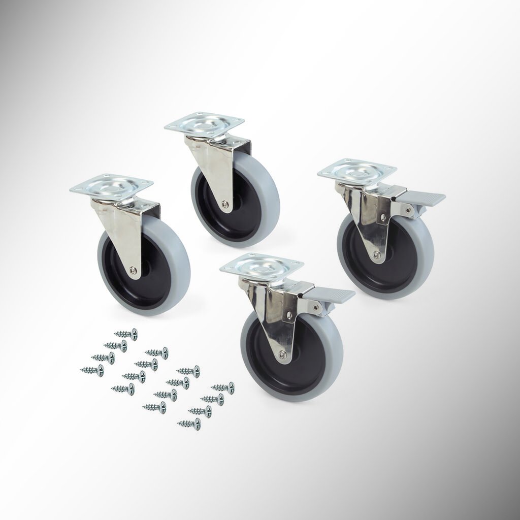 - Súprava: 4 kolieska (2 s brzdou, 2 bez brzdy) s montážnymi skrutkami.
