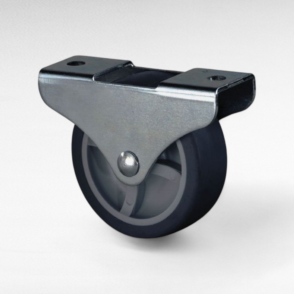 Pevné koliesko s mäkkým gumovým behúňom, ideálne pre použitie na nábytok a zariadenia, kde je dôležité chrániť podlahy a zaistiť tichý pohyb. Vhodné na rôzne typy podláh vrátane plávajúcich podláh, dreva a dlažby.
