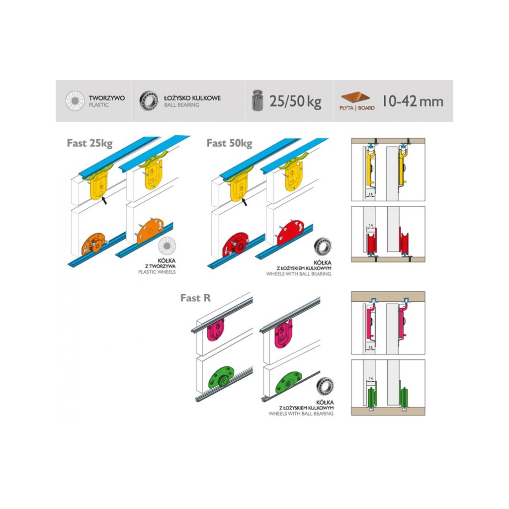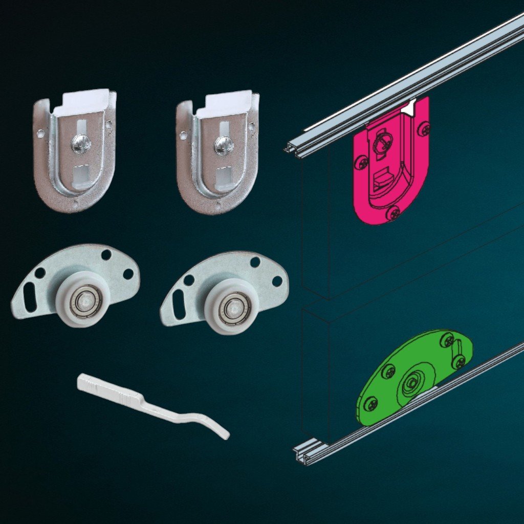 Sada na jedny posuvné dvere FAST R. Sada obsahuje: 2x horné vodítko (4417), 2x spodné koliesko (8811), 1x brzda Fast (4418)