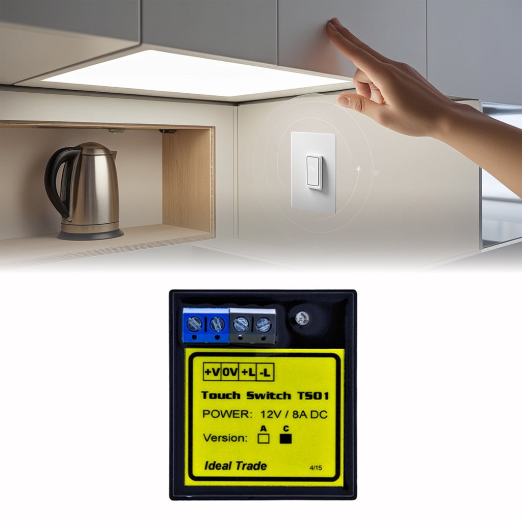 Moderný bezdotykový kapacitný spínač 12V A1 je ideálnym riešením pre skryté a nenápadné ovládanie osvetlenia alebo iných zariadení na napätí 12V DC.