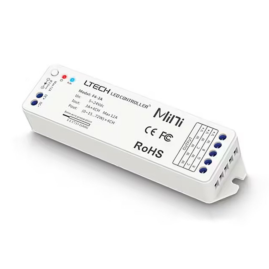 Napäťový prijímač pre ovládanie ľubovoľnej svetelnej zostavy (single COLOR, CTA, RGB, RGBW) RF signálom.