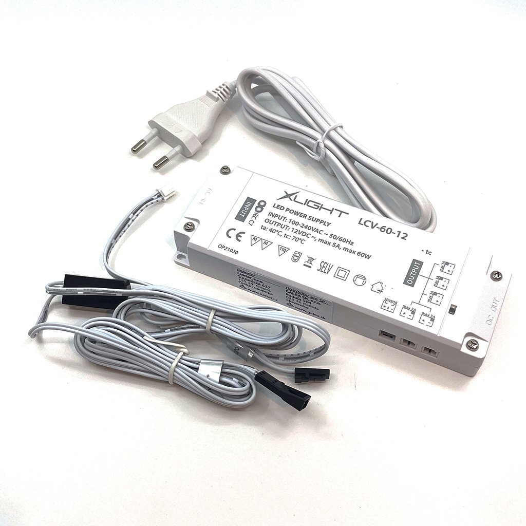 TRF3 - zdroj pre LED osvetlenie. Vstup 100-240 V AC sieťový kábel cez konektor C7, výstup 12 V DC 5 x mini LED konektor celkový výkon LED 60 W- 5 A, trojpinový port pre napojenie vypínača.