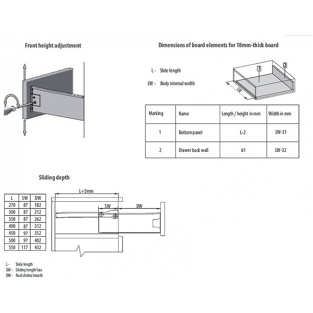 Súprava na výrobu zásuvky s kovovou jednoduchou bočnicou a čiastočným valčekovým výsuvom. Menovitá dĺžka zásuvky NL, systémová výška bočnice H a farba pozri názov výrobku. Súčasťou dodávky je poniklované čelné kovanie na skrutkovanie. Možno doplniť krytky čelného kovania v zodpovedajúcej farbe, pozri súvisiaci sortiment.