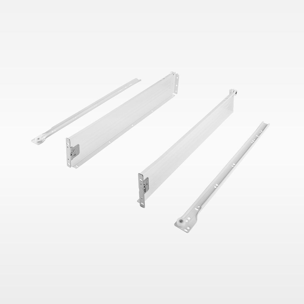 Súprava na výrobu zásuvky Metalbox s kovovou jednoduchou bočnicou a čiastočným valčekovým výsuvom. Tento systém ponúka spoľahlivé a odolné riešenie pre nábytkové zásuvky s jednoduchou montážou.