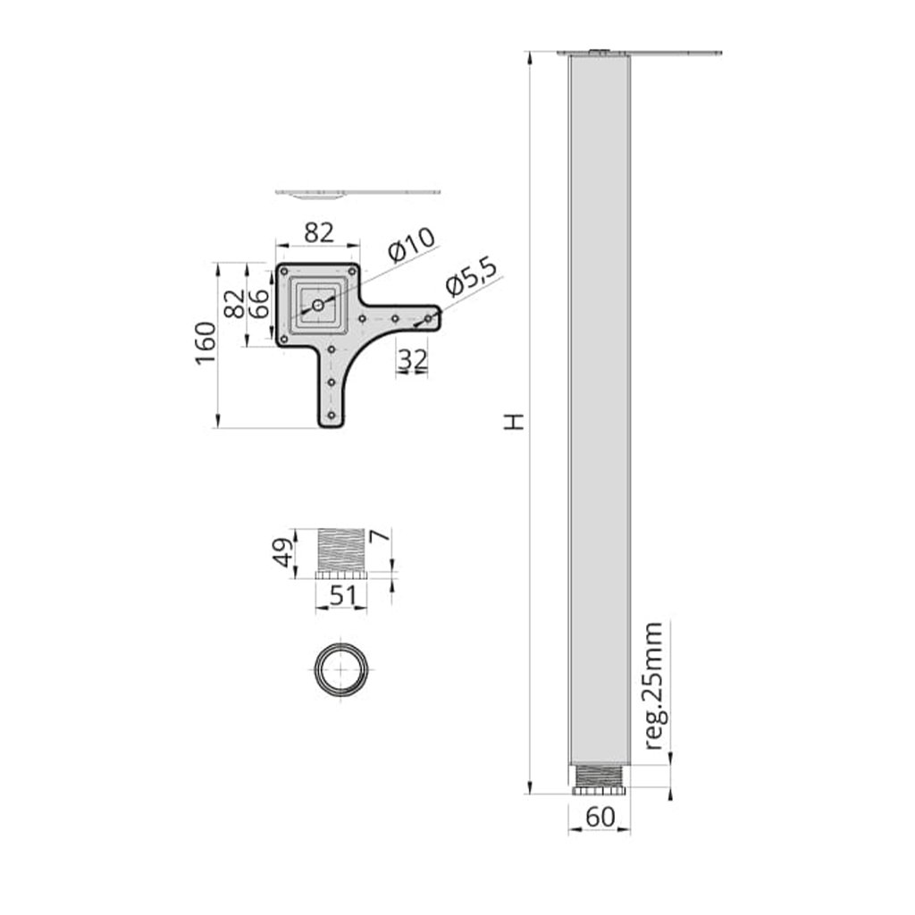 Moderná štvorcová stolová noha DN-270 je ideálnym spojením funkčnosti a minimalistického dizajnu. Vďaka nastaviteľnej výške zabezpečuje dokonalú stabilitu aj na nerovnom povrchu a je vhodná pre široké spektrum stolových dosiek.