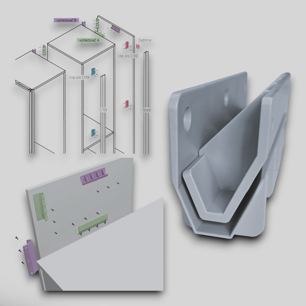 S159, 160/v - vymedzovač pre montáž úchytových profilov S159 a S160. Materiál plast. Cena je za 1 set: obsahuje 1xvymedzovač typ A, 1xvymedzovač typ B, skrutky. Vymedzovače slúžia pre jednoduché a rýchle vymedzenie 30 mm vzdialenosti medzi korpusmi, resp. medzi korpusom a falošným bokom. Množstvo potrebných vymedzovačov je v prípade profilu S159 zhodný s počtom klipov (t.j. 1 ks pre spodné uchytenie, 1 ks pre horné uchytenie a 1 ks pre každý ďalší 1 m dĺžky) a v prípade profilu S160 je potrebných navyše 2 ks vymedzovačov (1 ks hore a 1 ks dole) pre zaistenie výšky falošného boku.