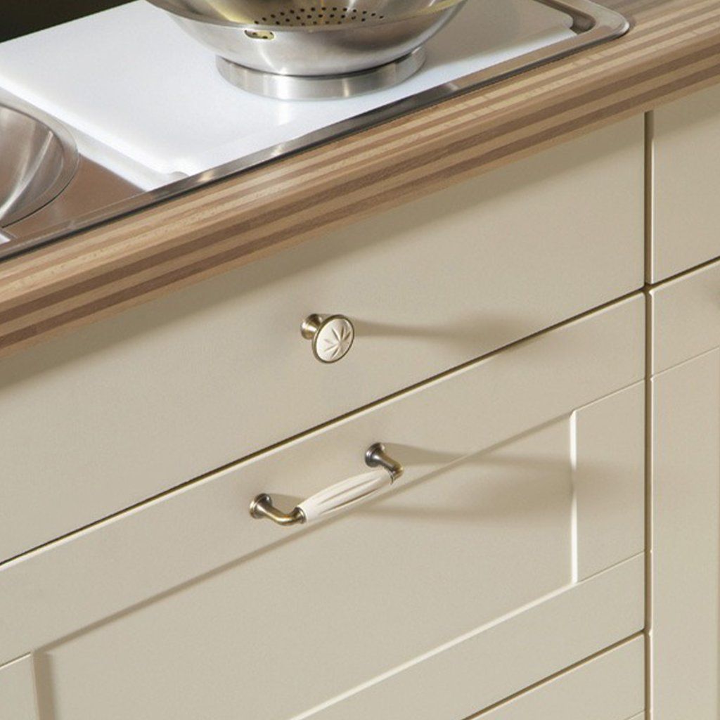 Stred knopky je ozdobený svetlou plastovou vložkou s reliéfnym motívom pripomínajúcim kvet alebo hviezdicu. Tento dekoratívny prvok podčiarkuje klasický štýl a vytvára jemný vizuálny akcent. Knopka je ideálnou voľbou pre klasické, vidiecke alebo rustikálne interiéry, kde doplní skrinky, zásuvky či komody.