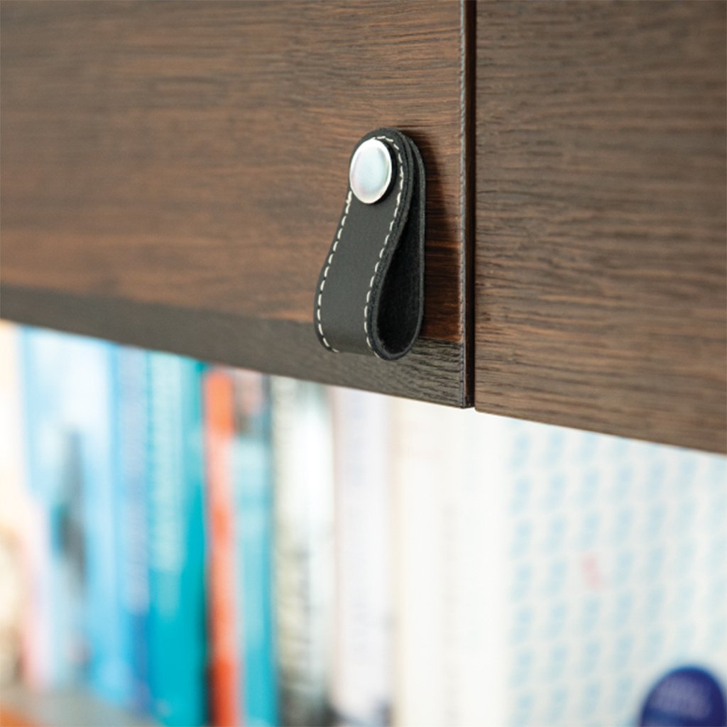 Štýlová nábytková knopka SIRO kombinuje eleganciu s prírodným vzhľadom vďaka pásiku z kvalitnej umelej kože s dekoratívnym prešívaním. Uchytenie v tmavom odtieni vytvára jemný kontrast a podčiarkuje jej charakter.