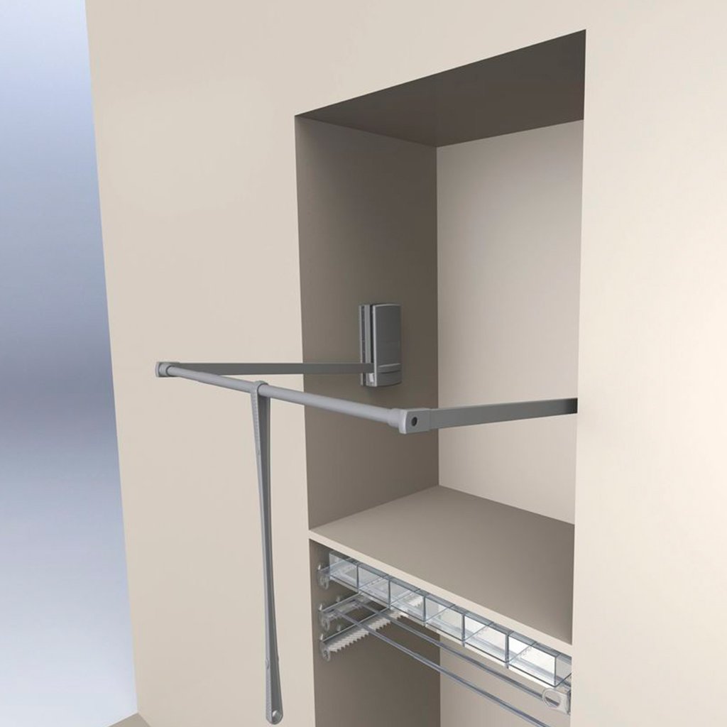 Praktický a výškovo nastaviteľný sklopný vešiak je ideálnym riešením pre vysoké vstavané šatníkové skrine. Umožňuje jednoduchý prístup k oblečeniu vo vyšších častiach skrine vďaka sklopnému mechanizmu s tiahlem a spätnou pružinou. Je navrhnutý na obojstranné upevnenie do vnútorných stien korpusu a je plynulo nastaviteľný podľa šírky skrine.