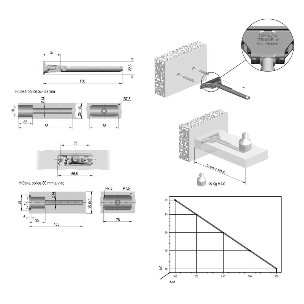 Skrytá konzola TRIADE je inovatívne riešenie pre montáž políc s hrúbkou 30 až 40 mm. Vďaka svojej trojstranne nastaviteľnej konštrukcii umožňuje jednoduché vertikálne, horizontálne aj sklonné nastavenie police, čím zaručuje jej presnú inštaláciu. Nosnosť jedného páru konzol je 30 kg (polica s maximálnou hĺbkou 300 mm), čo zaisťuje stabilitu a bezpečnosť. Montáž je jednoduchá, pomocou hmoždiniek a skrutiek, s minimálnymi požiadavkami na veľkosť otvorov v polici. Konzola TRIADE ponúka ďalšie výhody, ako je bezpečnostné zamknutie a možnosť opakovanej montáže.