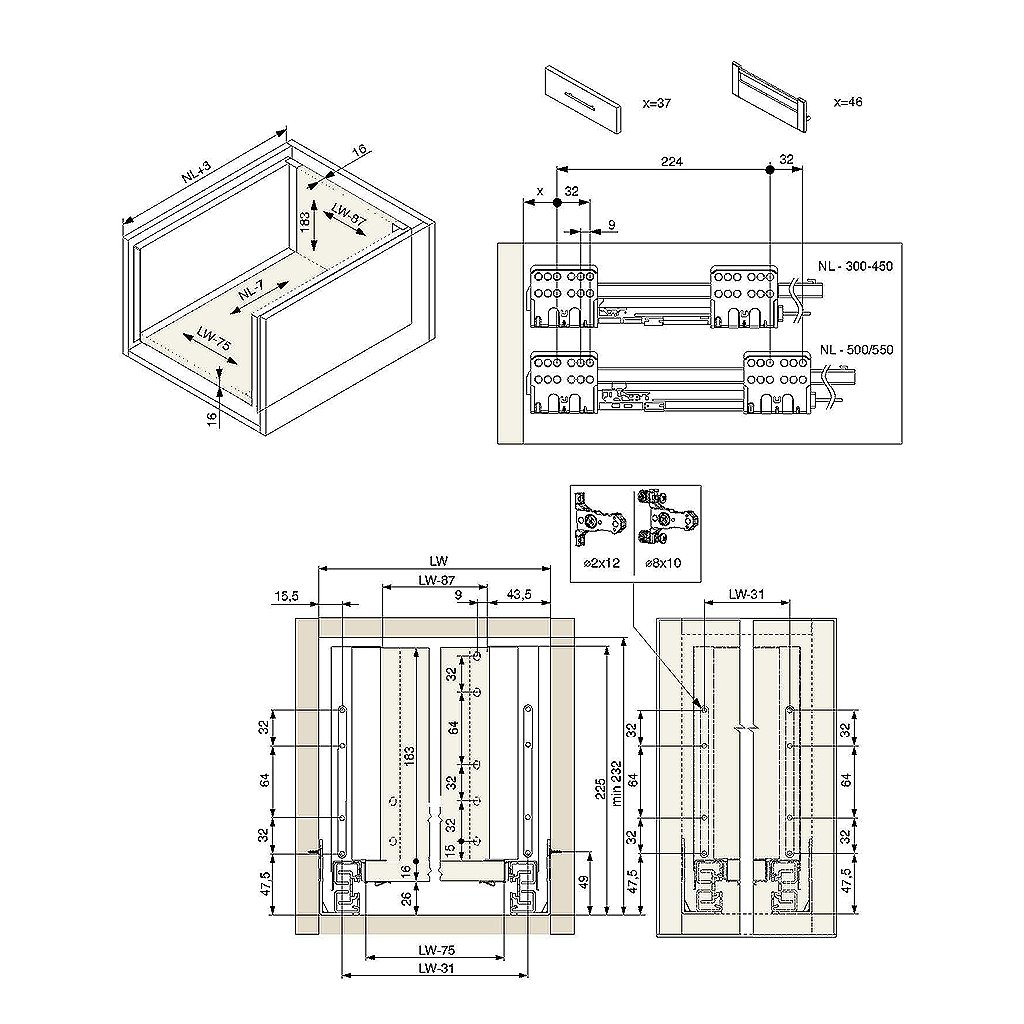 Skrytý výsuv ND60 (16 mm) s dvojitou bočnicou, 199/450 mm, Biela