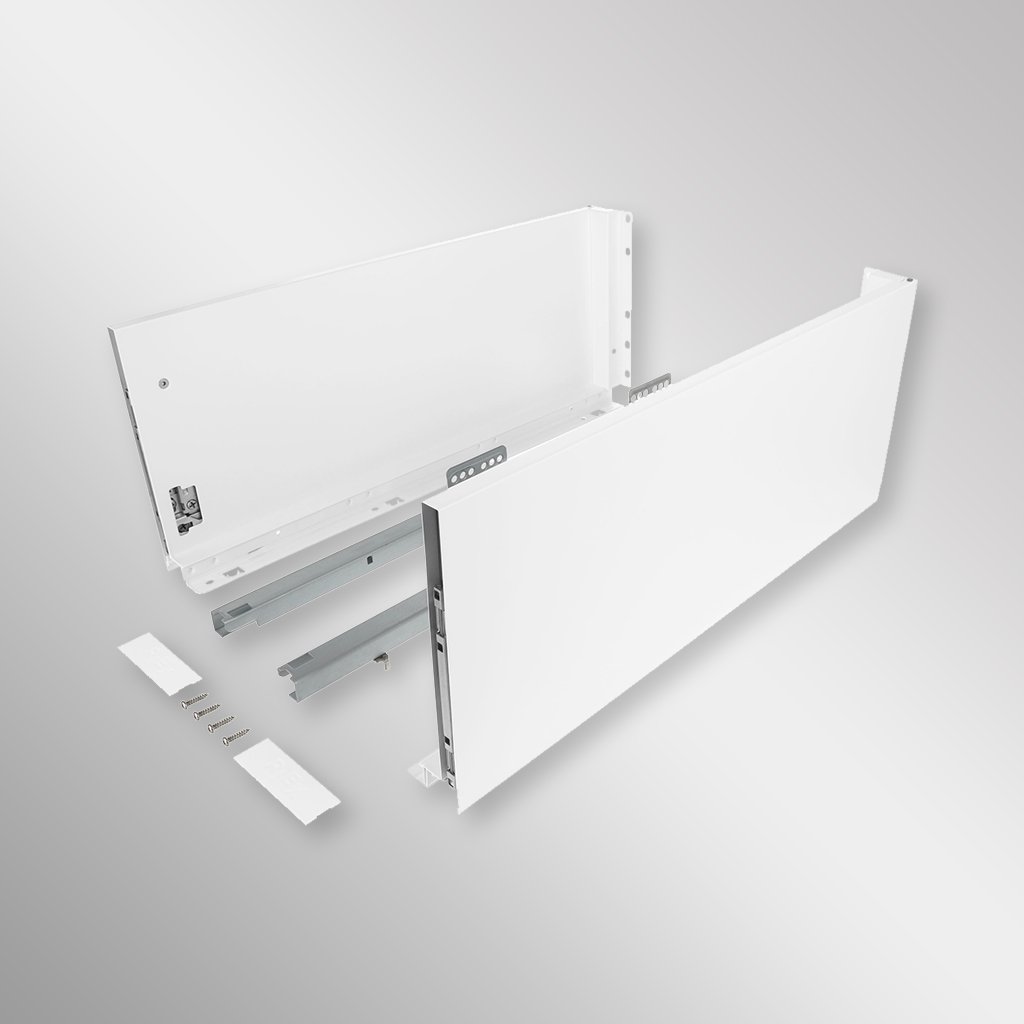 Zásuvky ND60 s úzkou dvojitou bočnicou ponúkajú kombináciu praktickosti a estetiky. Nosnosť 40 kg a možnosť pridania relingov zaručujú ich univerzálne využitie. Mechanizmus tlmenia a synchronizácie poskytuje tichý chod a hladké zatváranie zásuvky, čo oceníte pri každodennom používaní.