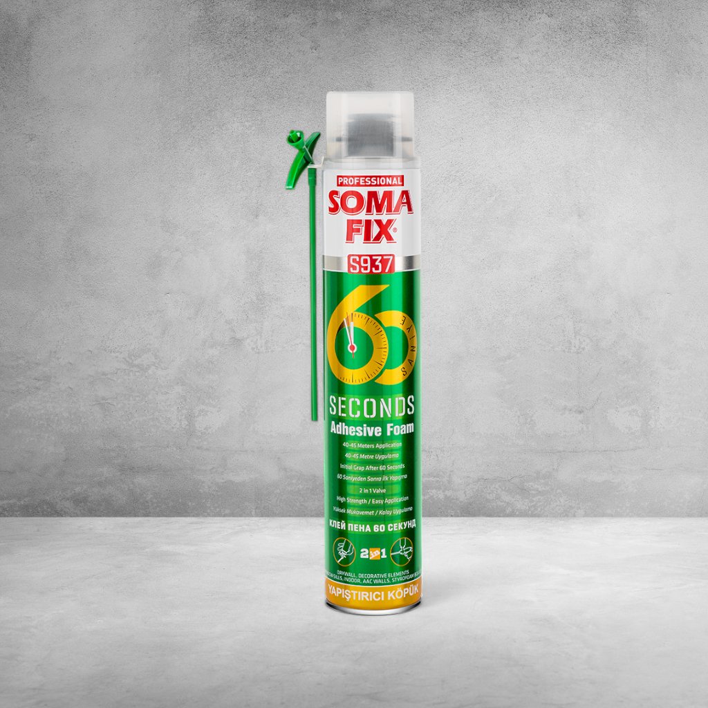 SomaFix 60-sekundové lepiace pena je jednosložková polyuretánová pena s rýchlym a silným lepiacim účinkom, ktorý začína pôsobiť už po jednej minúte. Je ideálna na použitie s perforovanými aj neperforovanými tehlami, kameňom, drevom, okennými a dverovými rámami, podlahami, dekoračnými prvkami, sadrokartónom, preglejkami, EPS a XPS panelmi, minerálnou vatou a pri murovaní blokov. Priľne ku všetkým stavebným materiálom, s výnimkou silikónu, teflónu, polyetylénu a polypropylénu. Po vytvrdnutí nemení objem a odoláva všetkým poveternostným podmienkam, zriedeným kyselinám, korozívnym roztokom, pare a vlhkosti.
