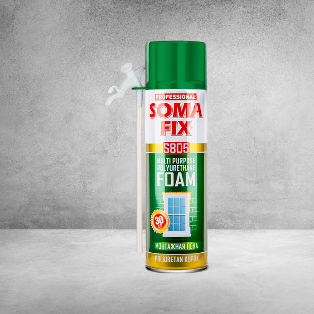 SomaFix S805 ručná PUR pena je viacúčelová montážna a výplňová pena, ktorá tvrdne v priebehu 1-3 hodín v závislosti od vlhkosti vzduchu. Je ideálna na inštaláciu okenných a dverných rámov, vyplňovanie medzier a izolačné práce okolo vodovodných potrubí a elektrických zariadení. Táto pena účinne vyplňuje štrbiny, otvory a praskliny, pričom dokonale priľne na betón, omietku, murivo, drevo, plasty a kovové povrchy.