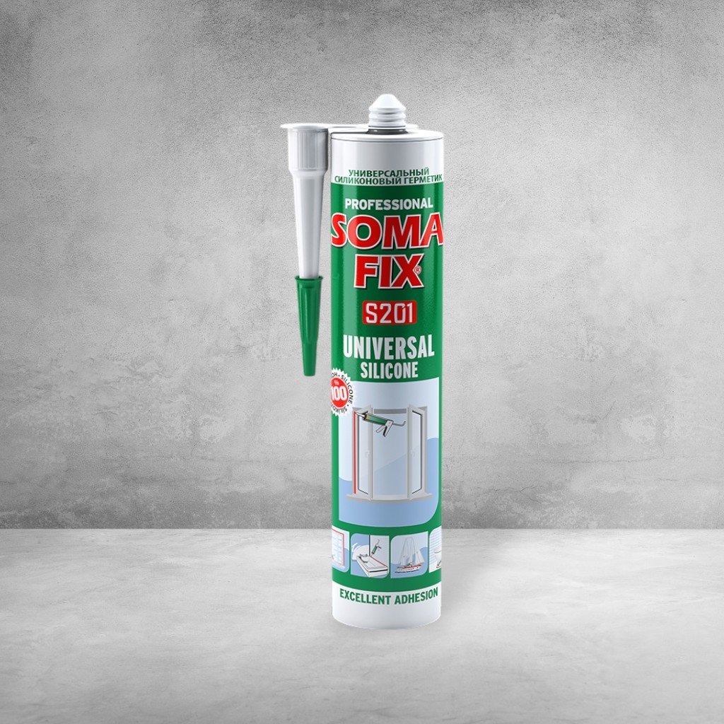 SomaFix S201 univerzálny silikón je jednosložkový, pružný, bezrozpúšťadlový 100% silikón, ktorý tvrdne pôsobením vlhkosti zo vzduchu. Tento silikón je vhodný na použitie v interiéri aj exteriéri, poskytuje pružné, UV-odolné a vodotesné tesnenie. Vďaka svojej silnej priľnavosti je ideálny na lepenie dlaždíc, keramických spojov, drevených materiálov, PVC dverí, okien, panelov a parapetov. Možno ho použiť aj na montáž dreveného nábytku, schodísk, dekorácií, tesnenie vaní, umývadiel, dlaždíc a keramických spojov. Zabezpečuje výbornú izoláciu proti vode, hluku a prachu.