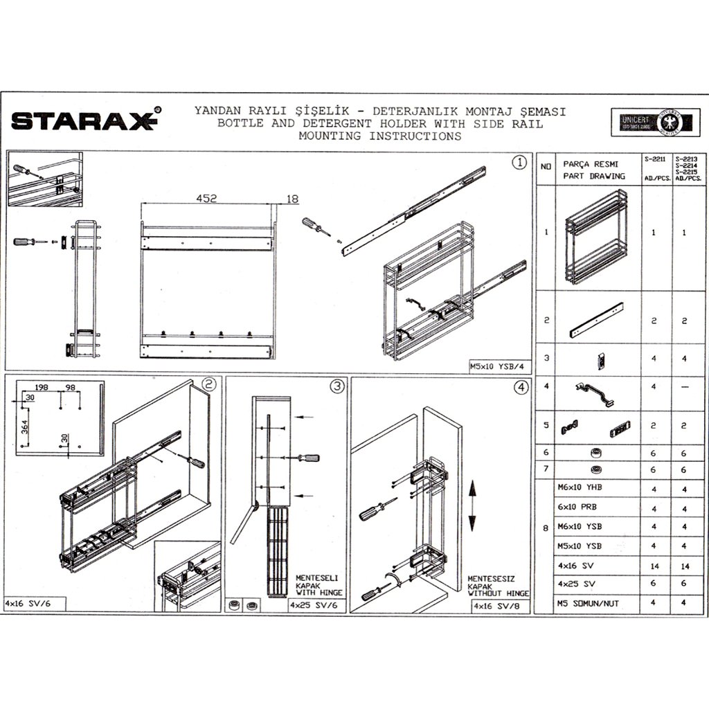 Výsuvný drôtený kôš STARAX s dvomi policami je praktický a efektívny systém pre organizáciu kuchynských potrieb, ako sú fľaše, saponáty a ďalšie drobnosti. Vďaka plnovýsuvu Tandem s tlmeným dovieraním od Blum sa kôš vysúva plynulo a spolu s dvierkami skrinky, čo zvyšuje komfort a uľahčuje prístup.