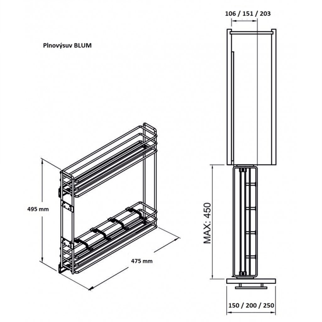 - Šírka korpusu (C): 150 mm a 200 mm (vonkajšia šírka skrinky)