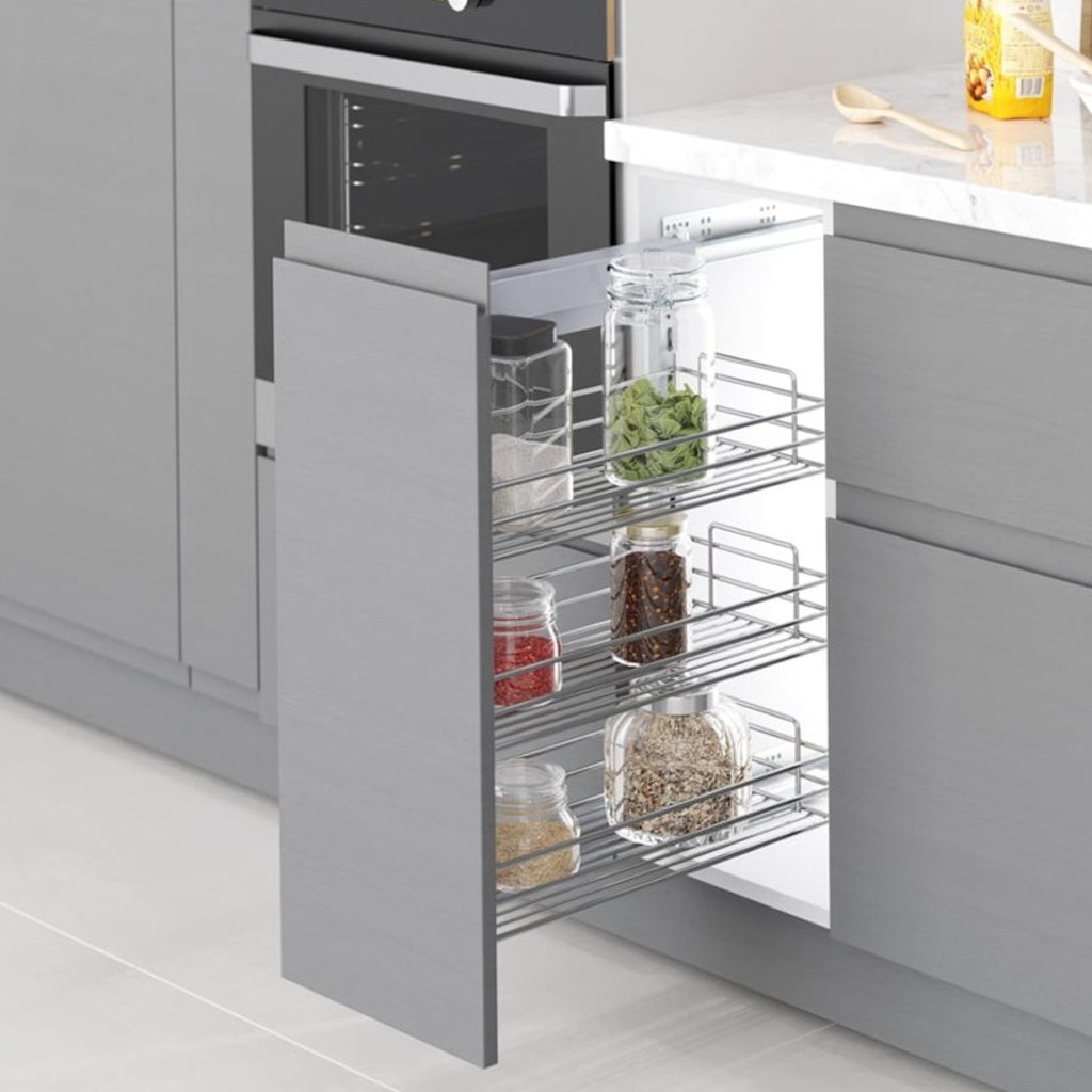 Výsuvný drôtený kôš STARAX s tromi policami je praktickým doplnkom pre kuchynské skrinky, ideálny na uloženie fľašiek, dóz a rôznych drobností. Vďaka plnovýsuvu Tandem od Blum s tlmeným dovieraním ponúka pohodlné a tiché vysúvanie spolu s čelom dvierok, čo uľahčuje prístup a zlepšuje organizáciu kuchynského priestoru.
