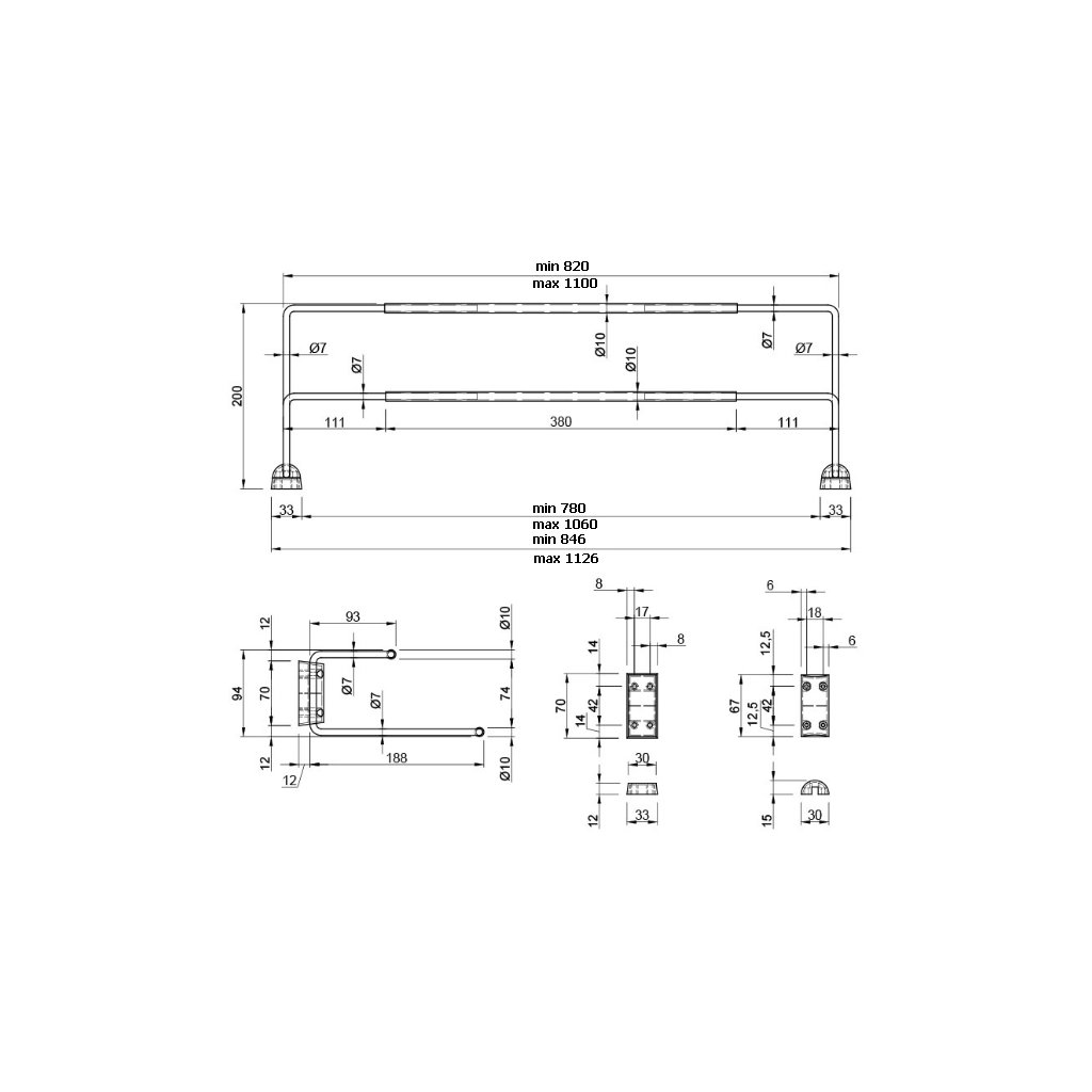 Rozmery (ŠxHxV): 820-1100 x 200 x 95 mm