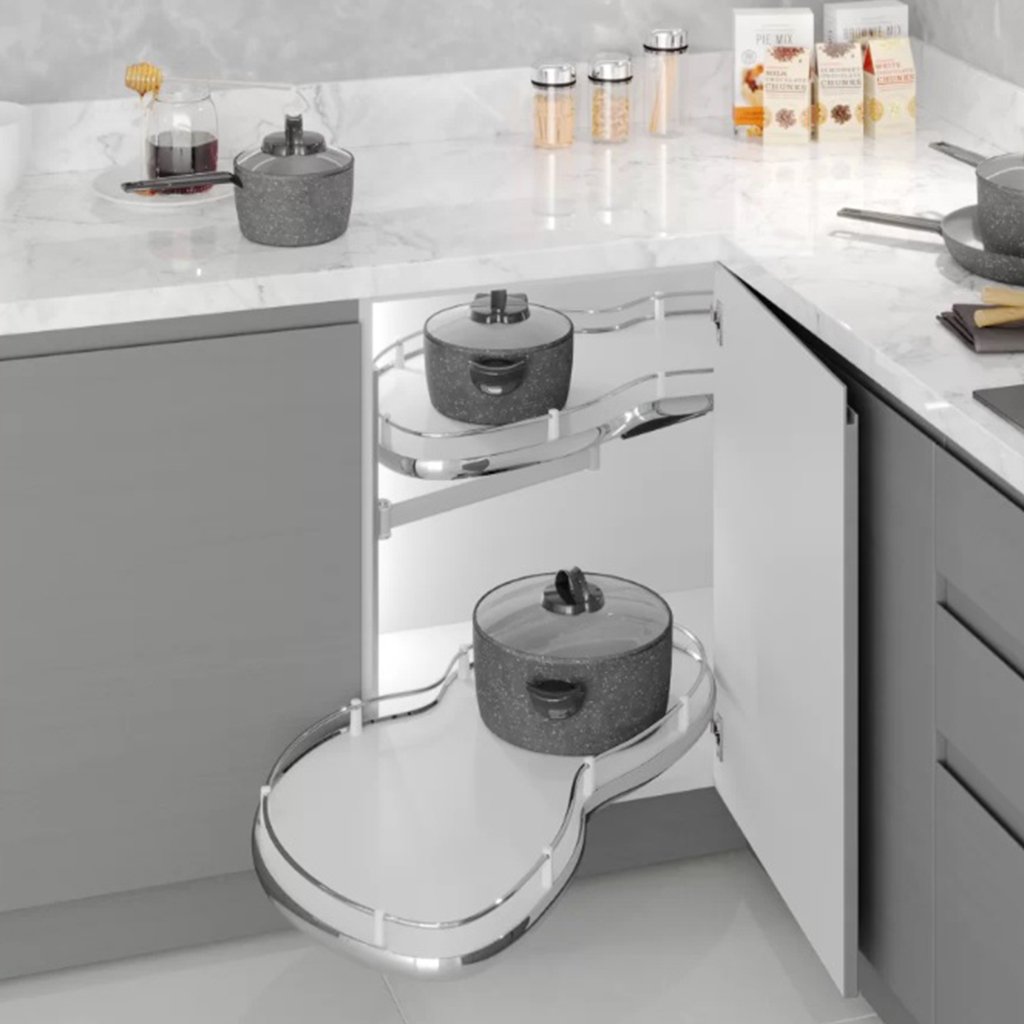 Tento rohový policový systém SECRET je ideálnym riešením pre lepšiu organizáciu a jednoduchý prístup k uloženým veciam v ťažko dostupných rohoch kuchynskej linky.
