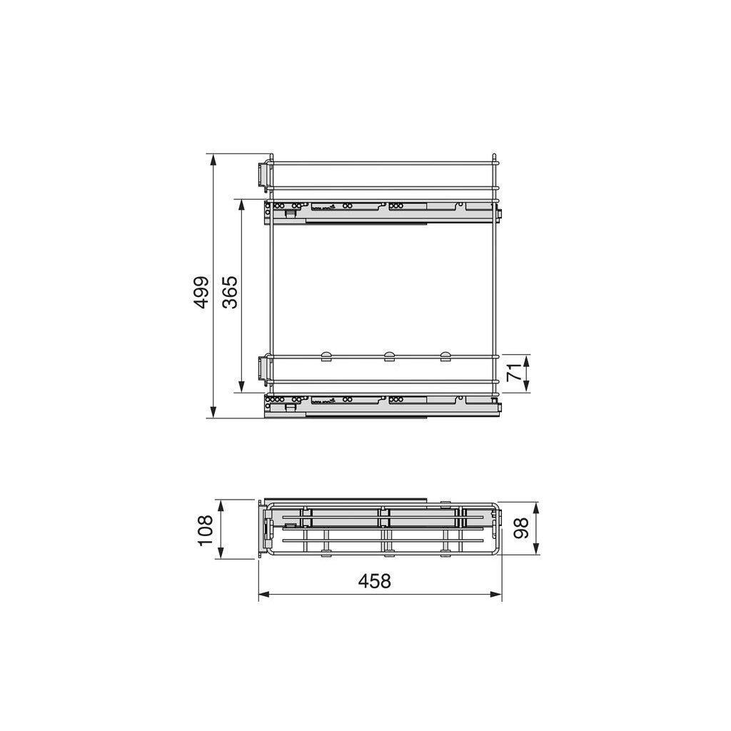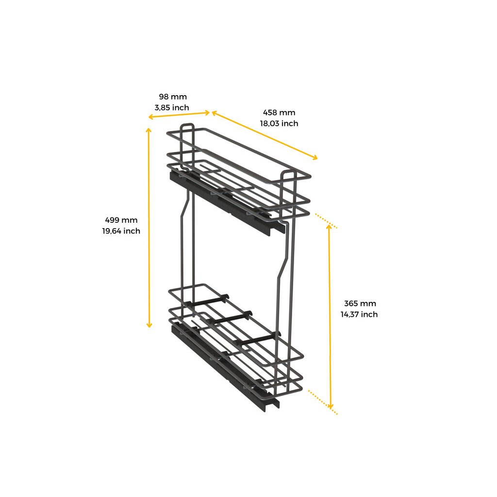 TitaneMax Cargo 150 je praktický a elegantný výsuvný systém určený pre kuchynské skrinky. Je ideálny na uskladnenie fliaš a drobných kuchynských potrieb vďaka dvom košom a trom deliacim priehradkám v spodnom koši. Tento výsuvný systém je navrhnutý pre jednoduchú montáž a maximálnu funkčnosť.