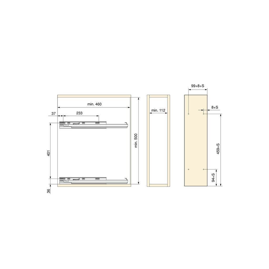 - Univerzálnosť: Vhodný pre moduly s minimálnou vnútornou šírkou 112 mm a minimálnou hĺbkou 460 mm. Kompatibilný so skrinkami z dosiek s hrúbkou 16, 18 a 19 mm.
