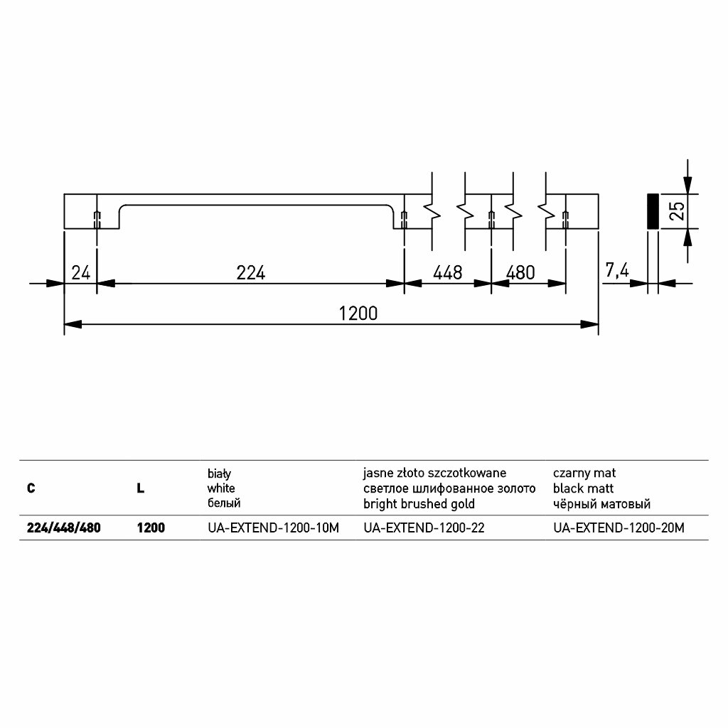 Úchytka EXTEND má výšku 1200 mm a je dostupná v troch univerzálnych farebných variantoch: biela, brúsená zlatá, matná čierna.