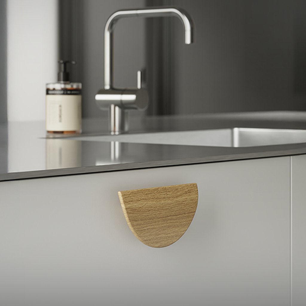 Kolekcia HORIZON od Furnipart pôsobí, akoby sa vznášala nad povrchom panelu. Má tvar polmesiaca a elegantný prechod z plochej na zaoblenú časť na prednej strane. Dizajn je univerzálny, umožňuje rôzne orientácie – pri dvoch úchytkách umiestnených na susedných paneloch vytvára kompletný kruh.