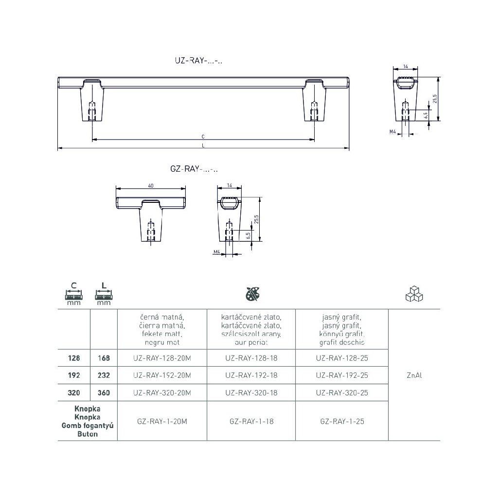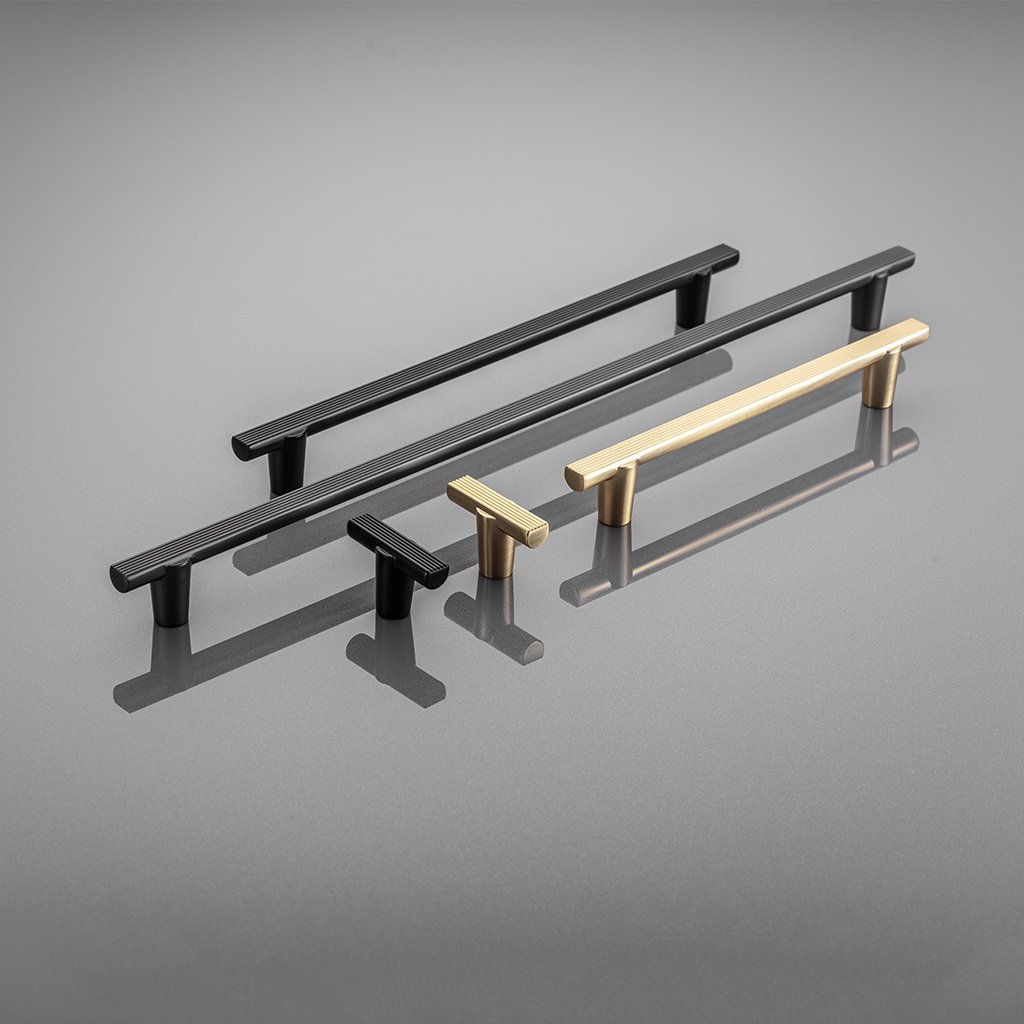 Kolekcia RAY ponúka úchytky v troch rozmeroch: 128 mm, 192 mm a 320 mm, a tri zodpovedajúce gombíky v farbách: matná čierna, brúsené zlato a svetlý grafit.