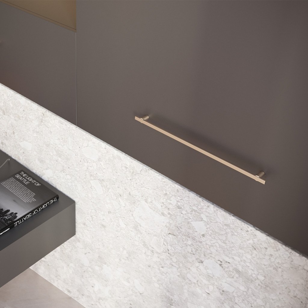 Úchytka RAY je skvelou voľbou pre tých, ktorí si cenia klasický a nadčasový dizajn. Jednoduché a jemné línie týchto úchytiek dodávajú nábytku ľahkosť, zatiaľ čo ich sofistikované zlaté brúsené prevedenie dokonale ladí s rôznymi druhmi predných panelov. Vďaka tomu vytvárajú interiérové riešenia s úchytkami RAY atmosféru pokoja, harmónie a symetrie.