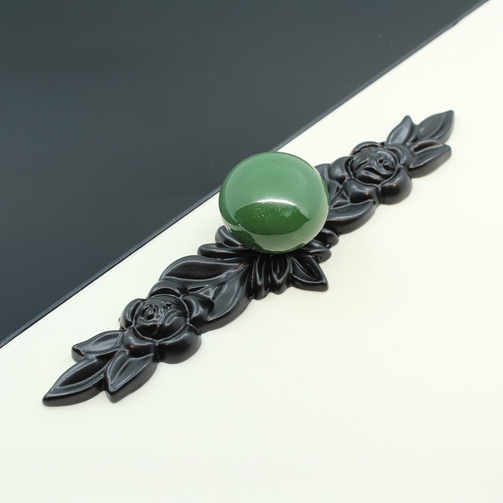 Štýlová nábytková úchytka TOMURCUK 1800 v kombinácii čierneho kovu a zeleného porcelánu dodá vášmu nábytku jedinečný vintage vzhľad. Je ideálna pre retro, vintage alebo provensálsky štýl a krásne vynikne na svetlých aj tmavých nábytkových plochách.