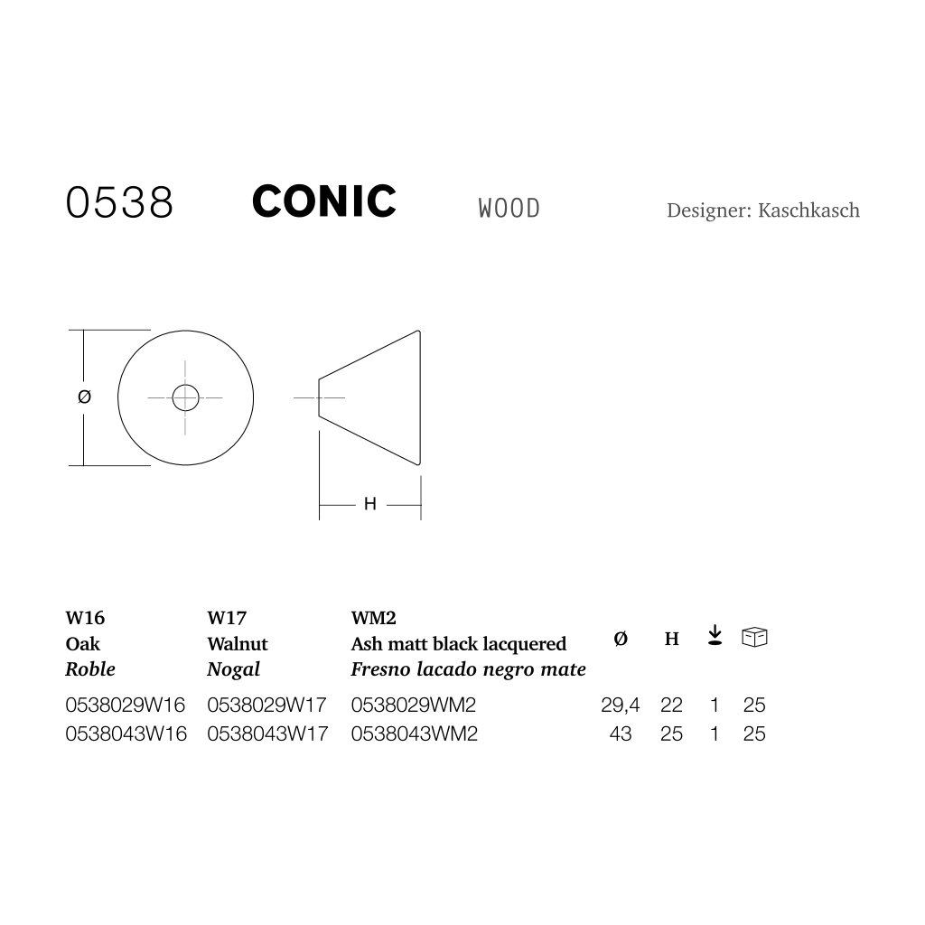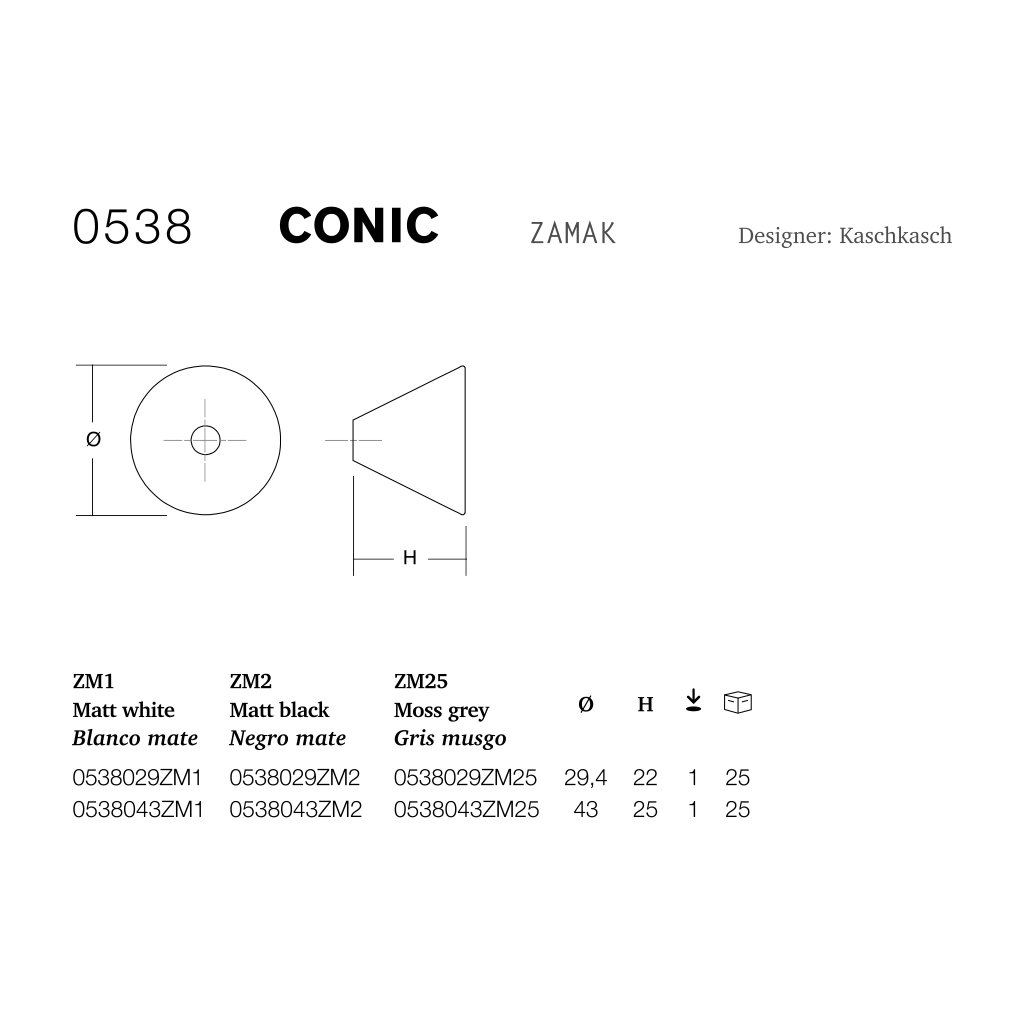 Knopka CONIC bola navrhnutá nemeckým dizajnérskym duom Kaschkasch. Je dostupná v dvoch materiálových prevedeniach: zamak alebo drevo. Zamaková knopka CONIC je dostupná v troch povrchových úpravách: v matnej bielej, matnej čiernej a novej machovo šedej. Drevená knopka CONIC je dostupná v troch povrchových úpravách: prírodný dub, orech a čierno lakovaný dub.Vďaka použitým materiálom a neutrálnym farbám sa knopka hodí do všetkých interiérov a dekoratívnych štýlov. Všestranná a ergonomická knopka CONIC sa hodí na súčasný kúpeľňový aj spálňový nábytok, ale aj na kuchynské linky v rustikálnejšom štýle.