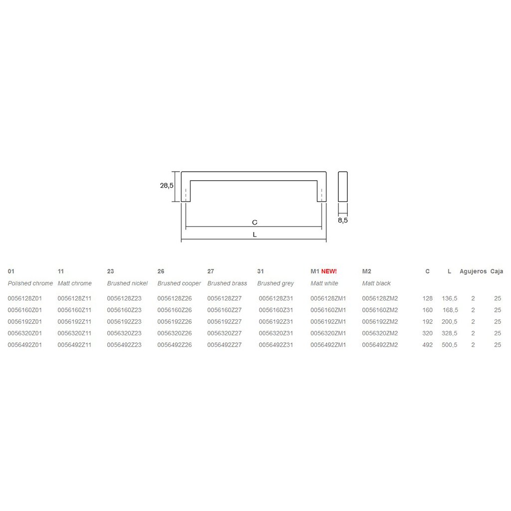 U je minimalistická úchytka s rovnými líniami, jemná a elegantná. Tento univerzálny a 100% praktický bestseller sa dokonale prispôsobí rôznym nábytkovým štýlom. Je to model, ktorý nikdy nevyjde z módy a vyznačuje sa všestrannosťou svojich povrchových úprav. Vyrába sa v prevedení leštený chróm, matný chróm, matná čierna, brúsený nikel, brúsená mosadz, brúsená šedá a brúsená meď.